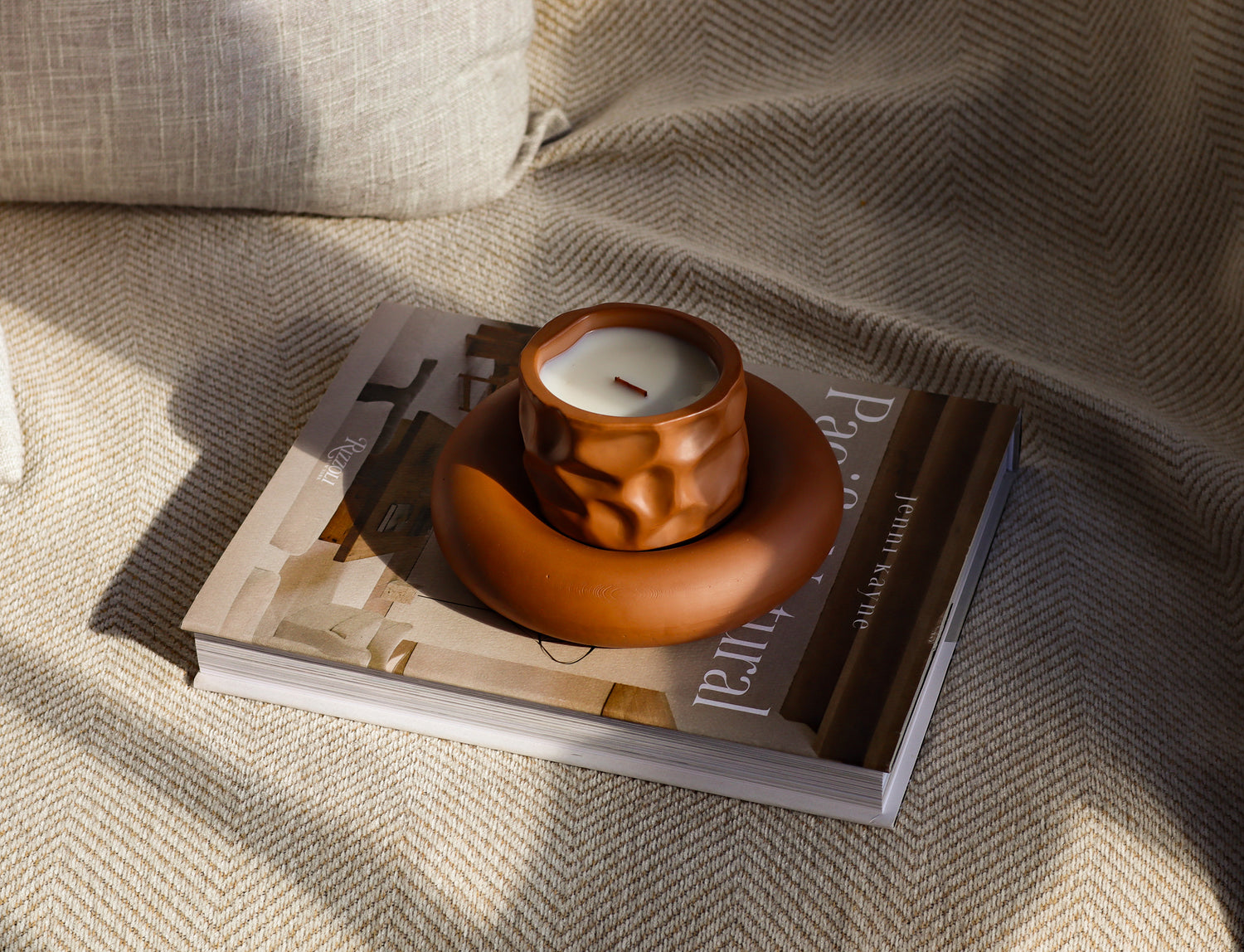 Inspired by smooth, carved stone, the Rocky Candle is housed in a textured Jesmonite vessel that brings natural elegance to any space. Hand-poured in small batches with a clean-burning coconut apricot wax blend, it features a wooden wick that creates a soft, soothing crackle as it burns. Designed to be both a functional candle and a statement decor piece.